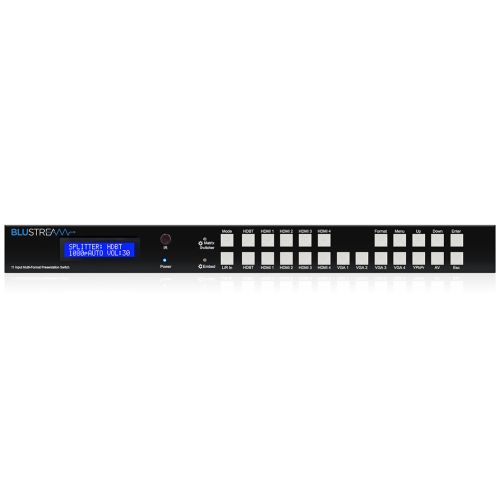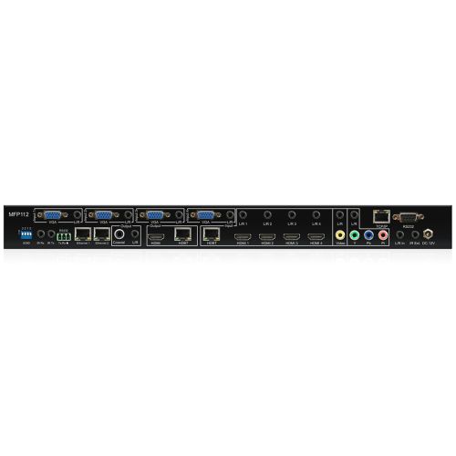 Our MFP112 is a multi-format presentation switcher within-built video scaling, audio embedding, de-embedding, EDID management and HDBaseT™ input and output. The MFP112 works in 2 modes, first as a 11 input dual output switcher, alternatively each output can work independently with HDMI output 1 routing the 1x HDBaseT™ + 4x HDMI inputs only and output 2 switching all 11 video + audio inputs.